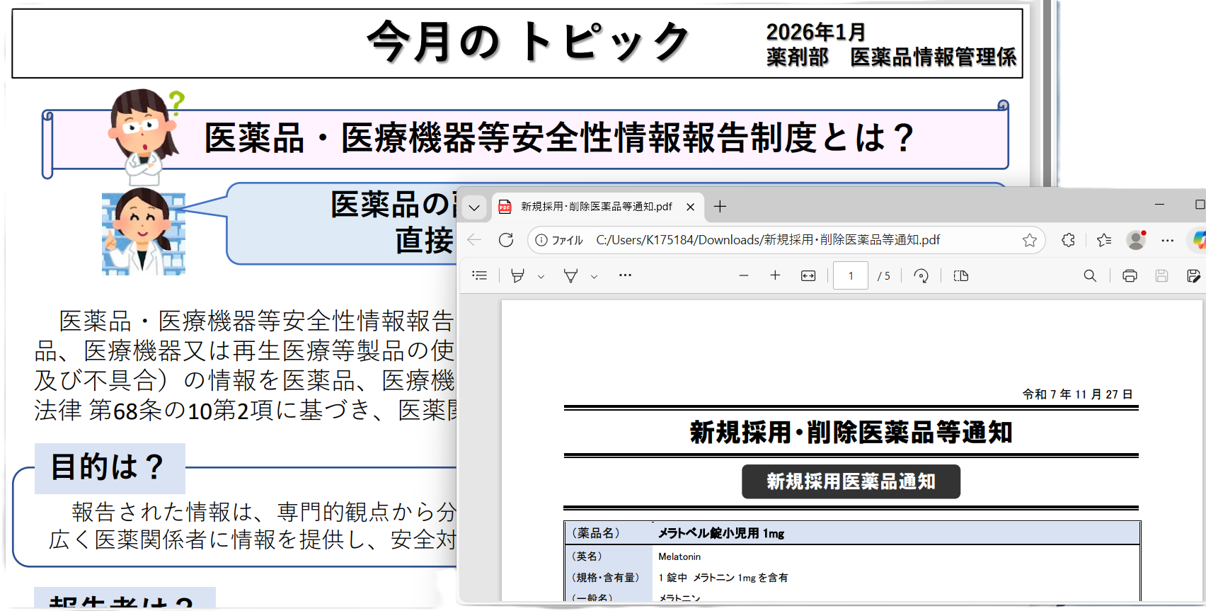 また、DIニュース(厚生労働省等から発行される緊急安全性情報や医薬品・医療機器等安全性情報、使用上の注意の改訂情報、新規採用・削除医薬品等通知、今月のトピック等)を毎月発行し、病院内へ伝達しています。